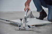 Profesionálna hliníková rezačka dlažby systémom "TLAČENÍM" pre diagonálne a priame rezy keramických a porcelánových dlažieb. Vozík s dvomi nastaviteľnými guľôčkovými ložiskami pre dobré kĺzanie a vysokú presnosť. Bočné predĺženia pre veľké formáty dlažieb. Pravítko na priame čítanie rovných aj 45°rezov.